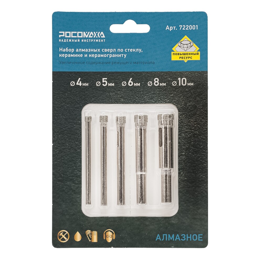 Набор алм.сверл по стеклу, керамике и керамограниту (4, 5, 6, 8, 10 мм) "РОСОМАХА"