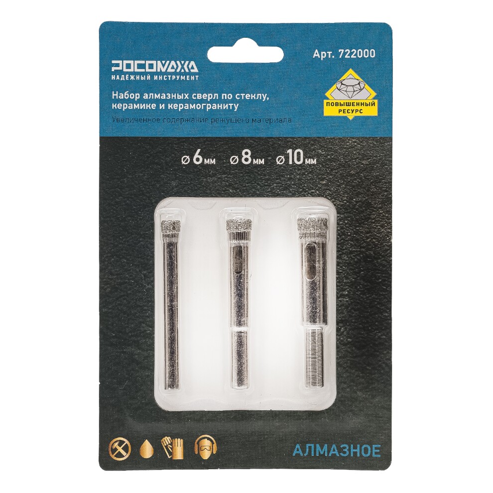 Набор алм.сверл по стеклу, керамике и керамограниту (6, 8, 10 мм) "РОСОМАХА"
